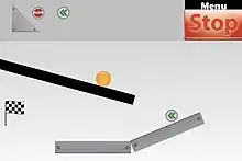 In each level of the game, the player is provided a different set of movable items ranging from basic shapes to power-ups that can speed the ball or reverse gravity. The screen also starts with a configuration of the same types of items and fixed walls that cannot be repositioned by the player. After positioning the movable items, the user presses the start button, and the movement of the items on the screen is simulated based on the laws of physics. The user has no further input after the start button is pressed, but can stop the simulation to reposition items as many times as necessary to find a configuration in which the ball eventually reaches the goal. The basic shapes include "metal" objects that stay fixed in position once the action starts, and wood objects that move in response to gravity or collisions with other objects. Moveable objects can be rotated as well as shifted in position.