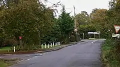 Lane south with side road into the modest developed area. The lane leads from the main road shown in the background to Binsted village