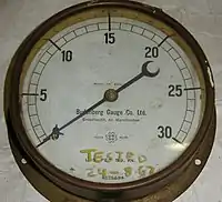 In 1914, the company moved from Whitworth Street to a new purpose built factory at Woodfield Road, Broadheath, Altrincham. Following the outbreak of war with Germany, Schaeffer & Budenberg was one of many German owned companies in the United Kingdom to be expropriated by the British Crown. Following the seizure of the company's Manchester subsidiary, Fred Budenberg (who was British born), was ordered to continue to run the business by the British Government for the duration of the war. Both of Fred's sons were fighting for the British in France. In 1917 Fred bought the company back from the British Crown, with the proviso by the Crown that all Board Directors were English born, and so the Budenberg Gauge Company Ltd. was formed and shares were held by a Public Trustee. The American branch was taken over by the Alien Property Custodian in 1917 and sold off in May 1919 to the American Gauge and Valve Co, with no continuing family connection, although it continued to operate as an independent entity until 1923. American Gauge was then bought by Manning Maxwell Moore and S&B continued as a separate division, even though sometimes working from the same premises. The Italian branch was liquidated by the Italian Government in 1915. The company business connections in St. Petersburg, Riga, Moscow, Vladivostock & Kiev were severed with the war and the Russian Revolution. The South American agencies stayed connected with the German company. The French and Belgian offices continued to operate by the Germans during the war. The Swedish and Swiss offices continued in a lesser way in neutral territories. The Polish, Czech and Austrian factories continued to operate as they were essential to the German war effort. The Warsaw factory ceased operations at the end of 1918, but there was a factory at Lodz at one period. A new office started in The Hague in 1918, and the offices in Lille and Liege continued after the war. During the huge inflation of 1923 in Germany the factory had problems with output and cash flow. Hitler's early preparations for the 1939-1945 war ensured the Germany company's existence and growth. During the Second World War the Magdeburg-Buckau factory was badly bombed and 60% of it was destroyed. It continued to operate under the Schaeffer & Budenberg name until 1946 when it was taken over and run by the Soviets as a form of war reparation. Its name was changed to the Karl Marx Messgeräte & Armaturenwerke in the newly communist East Germany. The British company, Budenberg Gauge continued to provide gauges for all areas of pressure work and flourished after a slow period in the 1950s due to the inability to source raw materials post WWII.