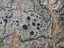 Buellia erubescens, the common button lichen, is a species of lichen in the genus Buellia.[1] It is found commonly on the bark and occasionally on the wood of Quercus, Pinus, Juniperus, or other species of trees with bark that has generally low pH. It is common between 600 and 3,000 m (2,000 and 9,800 ft) elevation, and is common in submontane to subalpine forests.[2]