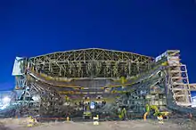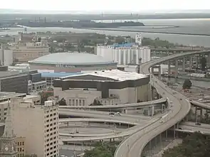 3. . "News Photo Gallery: May 9-10, 2009". boatnerd. 2009-05-09. Archived from the original on 2013-01-28. Retrieved 2013-11-21. Buffalo Memorial Auditorium (the "Aud") under demolition. The Buffalo Skyway Bridge crosses the Buffalo River to the right of the shot. The building's basement was dug through the remains of the junction of the Erie Canal and Main-Hamburg Canals in downtown Buffalo.