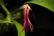 Bulbophyllum habrotinum is a species of orchid in the genus Bulbophyllum. It is found on lightly shaded tree limbs in the warm, 600–800 meter elevation forests of Borneo. It produces 4" long flowers.