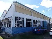 Workshop No.2 (Block M in 2017), for Motor Engineering, was planned in 1955, south of Block R, but was not built until 1958-9. By this time the use of timber for technical college workshops was less common.[76] Block M also had a twin sawtooth roof; and ramps to two of its doorways, on the west and south sides. The two workshop buildings were connected by a covered way at their east ends. In September 1958 estimates were provided for partitioning workshop No.2 for a car electrics lab, battery room, store, diesel fuel lab, fitting shop, tool room, metrology lab, and vehicle workspace and general workshop area. A hydraulic hoist was also fitted.[77][78][79][80] A skillion extension was added to the north side of Block M in the late 1960s.[81] A third workshop was added south of Block M by 1964, but did not have a sawtooth roof.[82][1]