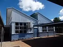 A smaller building (the eastern wing of Block G in 2017) was also constructed, as an annexe for cookery and woodworking classes, just to the south of Block D, with a parade ground between the two buildings. The annexe was lowset, with a Dutch gable roof which was sheeted with red fibre cement tiles. It had a cookery classroom on the east side, and a larger woodworking classroom on the west side. The interior had a coved ceiling with exposed metal ties. The walls of the woodworking room were unlined. There was a verandah on the north side, and a stair to the verandah led to a small, central, projecting bay with a gable roof. The walls were clad externally with weatherboards. The windows were casements, and two stove recesses, projecting from the southern elevation of the cookery classroom, had separate skillion roofs with short chimneys.[39][46][42] Although it predates standard designs for vocational buildings that were introduced in 1928, Block G shares a number of characteristics of the later buildings: it is lowset, timber framed, with a Dutch gable roof, a verandah, and a pair of stove recesses for the cookery classroom.[47][1]