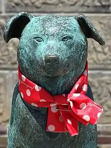 Bunkō would ride along with the firefighters during their dispatches, finding his role in helping to control the onlookers and in disentangling hoses.[1][4] It has been said that during his life Bunkō rode along on well over 1000 dispatches.[1] His long life ended at the age of 24, and his remains were stuffed and preserved.[1][3] To commemorate his achievements, a statue was unveiled in 2006, and picture books and other material for children have been written about his life and specific events within it.[1][4][3] He is also known as simply Bun in Japanese.[2][5]