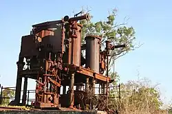 Remnants of the aerial tramway (flying fox) foundations are located outside the fenced enclosure around the engines. Part of the tram track is visible in front of the flying fox foundations. The tracks run north-south along the river bank and finish near the engines. The chimney stands slightly northwest of the engines.[1]