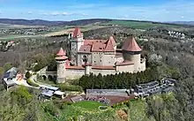 In the 18th century, the castle came into the possession of the Counts of Wilczek who had amassed a large fortune through their coal mines in Silesia. In 1874, Count Johann Nepomuk Wilczek, best known as a polar explorer, began reconstruction of the castle but in a style entirely different from the original Romanesque-Gothic architecture. The existing ruins were incorporated into the new castle, in particular, parts of the outer wall, the east tower and parts of the chapel.[4] The practised eye can easily distinguish between the surviving medieval masonry and the 19th century additions.