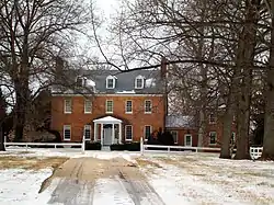 Burleigh, also known as Burleigh Manor or Hammonds Inheritance, is a historic home located at Ellicott City, Howard County, Maryland, built on a 2,300-acre (930 ha) estate. Which included "Hammonds Inheritance" patented in 1796.[2] It is a Federal-style brick dwelling built between 1797 and 1810, laid in Flemish bond. Based on the 1798 Tax assessment of the Elkridge Hundred, the original manor house started as a one-story frame building 24 by 18 foot in size. Also on the landscaped grounds are a 1720 stone smokehouse; a much-altered log, stone, and frame "gatehouse" or "cottage," built in 1820 as a workhouse for slaves and another log outbuilding, as well as an early-20th century bathhouse, 1941 swimming pool, and tennis court. Portions of the estate once included the old Annapolis Road which served the property until the construction of Centennial Lane to connect Clarksville to Ellicott City in 1876.[3] The manor was built by Colonel Rezin Hammond (1745–1809), using the same craftsmen as his brother Mathias Hammond's Hammond–Harwood House in Annapolis.[4] Rezin and his brother Matthias were active in the colonial revolution with notable participation in the burning of the Peggy Stewart (ship).[5] Hammond bequeathed the manor and 4,500 acres (1,800 ha) to [6] his grandnephew Denton Hammond (1785–1813) and his wife Sara who lived there until her death in 1832.[7][8] All slave labor were offered manumission upon Rezin Hammonds death in 1809, with extra provisions for tools, land and livestock for thirty two slaves.[9] The estate was owned by Civil War veteran Colonel Mathias until his death where he was buried alongside other family members on the estate.[10] His wife Clara Stockdale Hammond maintained ownership afterward. In 1914 the estate was owned by Mary Hanson Hammond with land totaling over 1,000 acres (400 ha) including the outbuildings and slave quarters.[11] In 1935 the Estate was subdivided to 600 acres (240 ha) and purchased by Charles McAlpin Pyle, Grandson of industrialist David Hunter McAlpin.[12] The manor house was renovated with the great kitchen replaced by a "Stirrup Room" where meetings of the Howard County Hunt Club were performed. The house was sold in 1941 to Mrs. Anthony J. Drexel Biddle, Jr. for use of Prince Alexandre Hohenlohoe of Poland during WWII. St. Timothy's School bought the property after the war in 1946, but abandoned plans and sold to Mrs G. Dudley Iverson IV in 1950.[13] The brick was once painted yellow, but by 1956, had almost returned to exposed red brick.[5] As of 2013, it has operated as a livestock shelter.[14]