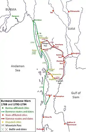 Siam under King Rama I attempted to claim the Tenasserim Coast and the towns of Tavoy and Mergui, which were former possessions of Siam during the times of Kingdom of Ayutthaya.[1] The defection of Burmese governor of Tavoy to Siam in March 1792 gave Siam an opportunity to realize the goals. With Tavoy and Mergui under control, King Rama I planned an expedition into Lower Burma.[2] However, King Bodawpaya of Burma, aiming to keep the Tenasserim Coast in Burmese control, sent his son Prince Thado Minsaw to counter Siamese offensives. The Siamese were soundly defeated in the Battle of Tavoy in January 1794 and retreated.