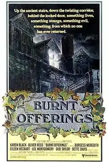 Burnt Offerings is a 1976 American supernatural horror film co-written and directed by Dan Curtis and starring Karen Black, Oliver Reed, Bette Davis, and Lee H. Montgomery, with Eileen Heckart, Burgess Meredith and Anthony James in supporting roles. It is based on the 1973 novel of the same name by Robert Marasco.[4] The plot follows a family who begins to interpersonally dissolve under supernatural forces in a large estate they have rented for the summer.