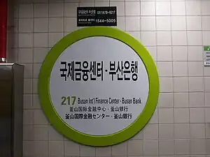 Busan International Finance Center·Busan Bank Station (Korean: 국제금융센터·부산은행역; Hanja: 國際金融센터·釜山銀行驛) is a station on the Busan Metro Line 2 in Munhyeon-dong, Nam District, Busan, South Korea. As its name suggests, Busan International Finance Center is located right next to the station. Prior to November 4, 2014, the station was named "Munjeon Station."[1]