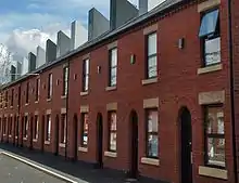 A great need in the late 19th century was for rental houses for the lowest paid workers. There also developed a need to build appropriate houses for skilled artisans and overseers. Building plots were sold to individuals, building clubs, and building societies who would try to minimise the building and land costs. The earlier houses were built in terraces of eight to twelve houses, but as wealth, confidence, and the demand for housing grew in the 1880s and 1890s, whole streets would be built together in the form of one long terrace.[6] Ginnels (entries) were set in after every fourth house, according to the act.