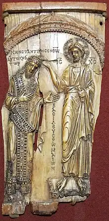 Imperial coronations are often found in Byzantine art, across a wide range of objects, from paintings and manuscript miniatures to ivory carvings and coins.[134] In most cases, and especially in coins and ivory plaques meant to commemorate the coronation (and possibly handed out as gifts by the emperor), the emperor or imperial couple are shown being crowned by Christ, the Theotokos, or an archangel. This is meant to symbolize the special connection between the emperor and God, and the notion of the emperor being chosen by God.[134] In contrast, the coronation scenes in the illuminated manuscript of the Madrid Skylitzes are meant to illustrate the narrative, and show the event in a historical setting, with the Patriarch of Constantinople performing the coronation.[134]