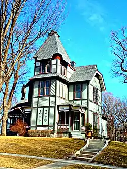 The C.C. Clement House is a historic building located in Fergus Falls, Minnesota, United States. Completed in 1882, the design of the 2½-story frame house was attributed to Fargo architect Charles N. Daniels.[2] The picturesque Stick style dwelling features a steep gabled roof with jerkin head and eave bracing. Also indicative of the style is the articulation of the wall surfaces by panel divisions with vertical and diagonal forms that suggest the structural frame underneath. Stick decorative elements are found in the pierced eave boards, the porch frieze with a saw-tooth edge and cut-out panels, turned posts and the floral design panels on the tower. The house was built by C.C. Clement who managed the interests of George B. Wright, one of the original developers of Fergus Falls. It remained in the Clement family until 1948 when it was sold to Wendell Hubers. The house was listed on the National Register of Historic Places in 1986.[1]