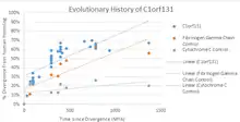 This gene family exists only in eukaryotes. There are no paralogs of this gene; however, there are a few pseudogenes of C1orf131. Thus far they have only been found in orangutans, mouse lemurs, and sloths.[11] When this gene family is compared to cytochrome C, a slow evolving gene,[23] and fibrinogen gamma chain, a fast evolving gene[24] it is shown to evolve at a faster rate than fibrinogen.