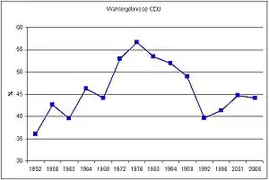 The CDU has been the governing party of Baden-Württemberg continuously from 1953 to 2011, the year Winfried Kretschmann of the Alliance '90/Greens won the regional state elections.
