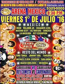 The International Gran Prix tournament and the July 1, 2016 CMLL Super Viernes show would feature several professional wrestling matches where wrestlers were matched up specifically for the tournament instead of as a result of pre-existing scripted feuds. The wrestlers themselves portrayed either heels (referred to as rudos in Mexico, those that portray the "bad guys") or faces (técnicos in Mexico, the "good guy" characters) as they perform for the fans before, during and after the matches. On June 1, 2016 CMLL held a press conference to reveal the details of the 2016 International Gran Prix. At the time CMLL officially announced "Team Mexico" which included Diamante Azul, Máximo, Mephisto, Rey Escorpión, Rush, Shocker, Último Guerrero and Volador Jr.[1] At the time they did not announce "Team International" but it was confirmed via a promotional video that team international would be Johnny Idol (USA), Kushida (Japan), Marco Corleone (Italy), Michael Elgin (Canada), Okumura (Japan), Sam Adonis (USA), Tama Tonga (Tonga) and Tanga Roa (Tonga).[1] Both Marco Corleone and Okumura were CMLL workers while Kushida, Elgin Tama Tonga and Tanga Roa were all sent by CMLL's Japanese business partner New Japan Pro-Wrestling (NJPW).[1] Idol and Adonis worked on the US Independent Circuit and had worked in Mexico for Desastre Total Universal (DTU) earlier in 2016.[1] During the June 3, Super Viernes show it was announced that the International Gran Prix would be available on internet pay per view (iPPV) in the same way they had made several of their previous major events available both in and outside of Mexico.[4][5]