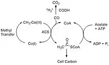 The Wood–Ljungdahl pathway consists of two different reactions that break down carbon dioxide. The first pathway involves CODH converting carbon dioxide into carbon monoxide through a two-electron transfer, and the second reaction involves ACS synthesizing acetyl-CoA using the carbon monoxide from CODH together with coenzyme-A (CoA) and a methyl group from a corrinoid iron-sulfur protein, CFeSP.[4] The two main overall reactions are as follows: