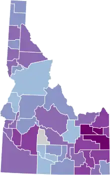 ![]() Map of the outbreak in Idaho by confirmed total infections per 100,000 people (last updated March 2021)
