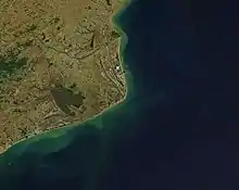 The Cabo de São Tomé is a peninsula in the state of Rio de Janeiro, on the coast of southeastern Brazil. It is 40 km southeast of the city of Campos dos Goytacazes. Further southeast is Cabo Frio where the coast turns east toward Rio de Janeiro. The cape was formed by sediment deposited by the Rio Paraiba do Sul. It was first sighted by Europeans in 1501.[1]