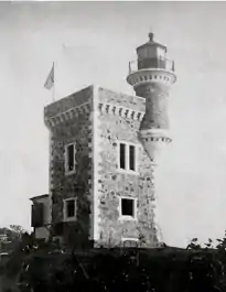 The lighthouse building was unique among the lighthouses in Puerto Rico in that it resembled the rectangular shape and design of the better-known light in the Morro, but with the castle's stone structure.[6] Differently from its San Juan relative, the building overseeing the Vieques Passage was a small two-story lightgray stone daymark structure with a red stripe and a clear white trim.[11] Its black lantern room sat on a small cylindrical tower on of its corners at the top of the building. It stood 78 feet off the ground, and projected a white light visible all around, showing higher intensity on range line for nine miles away (some even say 14).[12][13] Its original lens was a sixth-order Fresnel lens.[14]