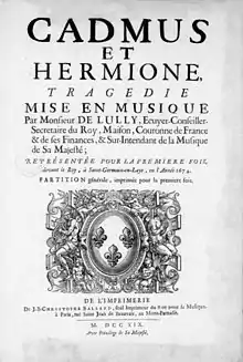 Cadmus et Hermione is a tragédie en musique in a prologue and five acts by Jean-Baptiste Lully. The French-language libretto is by Philippe Quinault, after Ovid's Metamorphoses. It was first performed on 27 April 1673 by the Paris Opera at the Jeu de paume de Béquet.