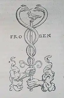The caduceus appears in a general medical context in the printer's device used by the Swiss medical printer Johann Frobenius (1460–1527), who depicted the staff entwined with serpents and surmounted by a dove, with a biblical epigraph in Greek, "Be ye therefore wise as serpents and harmless as doves" (Matthew 10:16, here in the KJV translation),[3] in keeping with the connotations of the caduceus as a symbol of messengers and publishers based on the association of Hermes or Mercury with eloquence and negotiation. Friedlander observed that Frobenius could hardly be considered a medical printer, as had previously been asserted, noting that in a review of 257 of the works bearing this printer's device only one was related to medicine. Similar use of the caduceus in printers' marks continues to the present day, with companies including F. A. Davis Company still using the symbol as an element of their insignia.