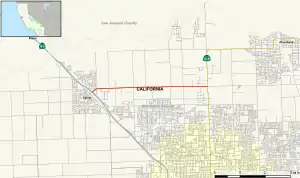 Except where prefixed with a letter, postmiles were measured on the road as it was in 1964, based on the alignment that existed at the time, and do not necessarily reflect current mileage. R reflects a realignment in the route since then, M indicates a second realignment, L refers to an overlap due to a correction or change, and T indicates postmiles classified as temporary (for a full list of prefixes, see California postmile § Official postmile definitions).[1] Segments that remain unconstructed or have been relinquished to local control may be omitted. The entire route is in Stanislaus County.