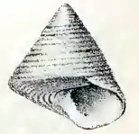 The size of the shell varies between 9 mm and 14 mm. The shell has a straightly conical shape. It is imperforate, solid, and rather thick with a yellowish flesh-color. It is sculptured spirally with numerous smooth riblets, alternately larger and smaller, 8 or 9 on the penultimate whorl, about 14 on the base, some of the interstitial ones near the axis quite small, the outer ones subequal in size. The spire is conic, its outlines straight. The sutures are scarcely visible except for a slightly wider cingulus above them. The whorls number about 6. They are flat, the last angular, nearly flat beneath, shortly deflexed at the aperture. The oblique aperture is rhomboidal, with a couple of prominent riblets inside the upper lip. The basal lip is thickened. The columella is straight or a trifle projecting in the middle.[3]