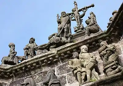 Note 1: Apart from the Prigent brothers and their team of masons, a major contribution was made to the Pleyben calvary by a sculptor who is known as "Le compagnon de Pleyben".[1] This third sculptor worked in grey sandstone rather than kersantite. The contributions were the heads of the soldiers and the Jewish priest in the "Ecce Homo" scene, Jesus and the devil in the scene depicting the devil tempting Jesus, Saint Peter in the scene depicting the agony in the garden of Gethsemane, all the figures in Jesus' arrest other than Jesus himself, the figures apart from Jesus in the scene depicting the appearance before Caiaphas, all the characters in the "Christ aux outrages" except for Jesus himself, the figures in the flagellation scene apart from Jesus and those in the scene depicting the crown of thorns being applied to Jesus' head again other than Jesus himself.[1]