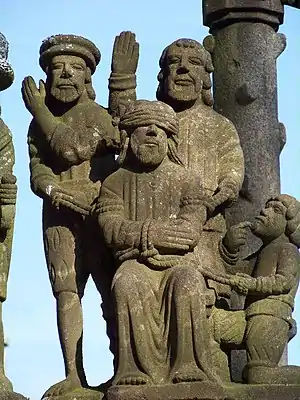 The Calvary of Plougastel-Daoulas in the arrondissement of Brest comprises a raised octagonal pedestal made from the yellow granite of Logonna-Dāaoulas, flanked by four thick arched buttresses. All the sculptural work is by the Maître de Plougastel except the horseman on the left of the crucifix which is by Millet.[1] It is a listed historical monument since 1889.[2]