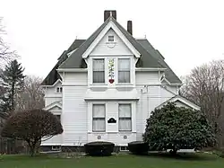 The Calvin T. Macomber House is a historic house located at 312 W. Brittania Street in Taunton, Massachusetts. It was built in 1885 for Calvin T. Macomber, who was employed at Reed & Barton.[2] It among the most complex examples of the Queen Anne style houses in the city, with an asymmetrical plan and a variety of architectural details. It has a steep hip roof, which is broken up by tall chimneys, projecting sections, and gabled dormers. Second floor windows have trim decorated with floral motifs.[3]