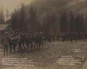 In 1893, a 17-metre (55 ft) bridge was erected across the river and a trail built up Pool Creek to the summit.[37] In 1895, a new 18-metre (60 ft) bridge was erected across the river.[38] By 1898, when the wagon road up the west side of the river was completed, a rowboat served the river crossing, because a bridge no longer existed at Camborne.[39] The next year, a more substantial ferry was installed,[40] which could carry five loaded packhorses,[41] Guided by a cable, the ferry was known as the Pool Creek ferry.[42] In 1900, the cable broke, sending five occupants downriver.[43] In 1901, a new footbridge was erected,[44] and a wagon road was built up the east side of the river.[45] The ferry operated at least until 1903.[46]