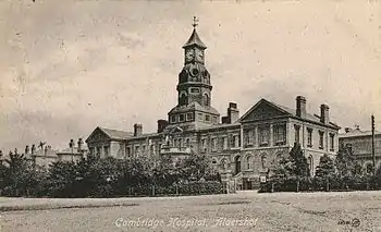 The Cambridge Military Hospital, built by Messrs Martin Wells and Co. of Aldershot, was located at Stanhope Lines;[2] the design was based on that of the Royal Herbert Hospital in Woolwich.[6] It was named after Prince George, Duke of Cambridge and opened on 18 July 1879.[1] The Louise Margaret Hospital for military wives and children was opened alongside in 1897.[7]