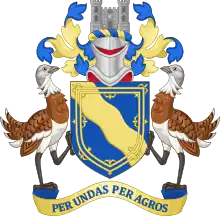 Or a double tressure flory counter flory gules, overall on a bend wavy azure three crowns or; the shield ensigned by a mural crown or. Supporters: on either side a great bustard proper, the exterior leg resting on a closed book gules, garnished or. Badge: Within an annulet issuant therefrom four fleurs-de-lys in cross an open crown or.[9]