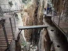 El Caminito del Rey (The King's Little Path) is a walkway pinned along the steep walls of a narrow gorge in El Chorro, near Ardales in the province of Málaga, Spain. Its name derives from the original name of Camino del Rey (King's Pathway), abbreviated locally to el caminito.[1] The walkway was constructed in the early 20th century, but by the early 21st century, it had fallen into disrepair and was partially closed for over a decade. After four years of extensive repairs and renovations, it re-opened in 2015. It has been described as the "world's most dangerous walkway" following five deaths in 1999 and 2000.[2]