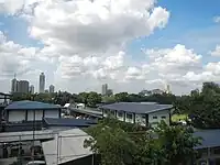The blue-roofed Philippine National Police, Camp Crame buildings as viewed from the Santolan - Annapolis station.