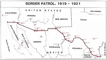 ![]() Map showing location of the U.S. Army southwestern border outposts, including Douglas, Arizona, the site of Camp Harry J. Jones. The main entrance was near what is today the intersection of West 10th Street and North Washington Avenue | |