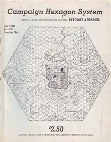 Campaign Hexagon System is a booklet presenting more than 60 blank hex grids. Each page contains a rectangular hexagonal tessellation consisting of roughly 1000 small hexes, with a large hex superimposed over this grid to represent a distance of 5 miles across flat land. The booklet includes additional guidelines to assist with a fantasy wilderness campaign, such as rules for Keen Sighting, Hydrographic Terrain (such as rivers and streams), Movement Obstacles, Prospecting (for valuable materials such as ore or precious minerals), Flora Types, Vegetables, and Fauna Classifications.[2]