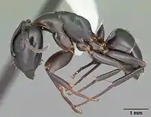 Workers can range from 3.5 to 7.5 mm (0.14 to 0.30 in) in length.[1] The queen ant's size can range from 4 to 10 millimetres (0.16 to 0.39 in).[2] This species can be distinguished from other subgenus by little amounts of erect hairs on the gena, limited erect hairs on the clypeal disc and finally by the color which is a concolorous dark brown-black.[1]
