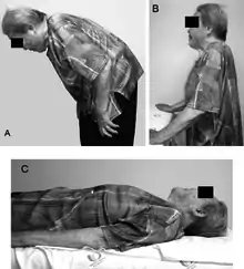 A clinical photograph showing a patient with the flexed posture. It can be abated when lying down.[1]