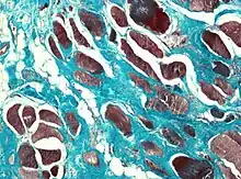 Spinal-muscle biopsy showing intense endomysial deposit of fibrosis (green) and fatty infiltration. Also observable is irregular distribution of involuted muscle fibers. (Trichrome, original magnification ×9100)[2]