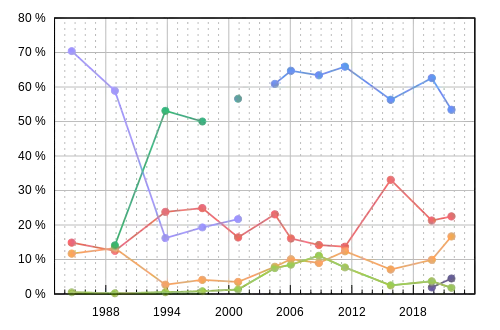 | Election | Liberal | Conservative | New Democratic | Green | People's | PC | Reform / Alliance |