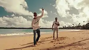 A screenshot from the music video, depicting Vives and Martin dancing on the beach.