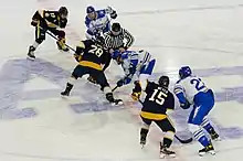 The Canisius Golden Griffins men's ice hockey team is a National Collegiate Athletic Association (NCAA) Division I college ice hockey program that represents Canisius College. The Golden Griffins are a member of Atlantic Hockey. They play at the LECOM Harborcenter in Buffalo, New York across the street from KeyBank Center, home of the Buffalo Sabres of the National Hockey League.[2] Canisius won an automatic bid to the 2013 NCAA Men's Ice Hockey Championship after winning the Atlantic Hockey title in the conference playoffs, but lost in the first round to top-ranked Quinnipiac.[3]