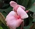 Canna 'Pringle Bay' is a miniature Italian and variegated group canna cultivar; variegated foliage, oval shaped, spreading habit; flowers are open, self-coloured pink, staminodes are large; fertile both ways, not true to type, not self-pollinating; rhizomes are thick, up to 3 cm in diameter, coloured pink and purple. Its main attraction is the bright variegated foliage, green, bronze and pink. Only about 40 cm in height.