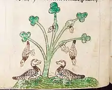 - ↑ The "un-named" island is a mystery. It is possible that Boece was thinking of Islay. In some versions of Boece's Historia..., The barnacle geese (claik geese) story appears in a section which also recalls Boece's beliefs on the mythical island of Thule. According to Anicius Manlius Severinus Boëthius (Boethius) a 6th-century philosopher, Thule or Tile refers to the western edge of the known world.
