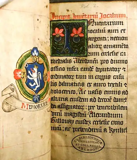 While his family circumstances remain unclear, Galloway had substantial wealth. He used this during his life to fund various projects as well as allowing him to live comfortably in residences in the parish where he was Prebendary (Kinkell) and in the Chanonry in Old Aberdeen. During his lifetime he provided funds to allow scribes to prepare records of the church St Nicholas in Aberdeen, the cathedral of St Machar in Old Aberdeen, and various Rectoral reports for King’s College (University of Aberdeen). It is believed that the 1549 report on his Rectoral “visitation” is in his own hand. He also provided funds to purchase lands for church purposes and in one instance for a Hospital for “Bedeswomen” at the Foot O’Dee in Aberdeen.[11] He took arms sometime after c.1500 that reference Fergus of Galloway.[12] These arms were used by Galloway to decorate many of his liturgical works.[13] They also appear in his own hand on an inventory of St Machar Cathedral.[14]
