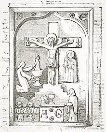 The panel that is now visible, in the ruins, is a copy made in the early 20th century after the original had been removed for restoration and lost in 1903. The original installation would have been painted and decorated with coloured wires. The Cross is adorned with the liturgic sign INRI. That is, IESVS·NAZARENVS·REX·IVDÆORVM (Iesus Nazarenus, Rex Iudaeorum) "Jesus the Nazarene, King of the Jews" (John 19:19). To the left of the cross is the Archangel St Michael the patron saint of Kinkell church. To the right the Virgin Mary. Below, to the left, is a representation Souls in Purgatory. Indicating ”preces sanctorum” – prayers for the dead. To the right, below, a figure that was probably Galloway. His initials and the Marian rose are depicted on the altar as well as on the frame of the plaque. Steven Holmes