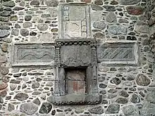 Third, a baptismal font. This can be seen in St John’s Episcopal Church, Crown Terrace in Aberdeen. The bowl is octagonal with sunken panels on each face. This design is striking when compared to other medieval fonts in Scotland.[24] The liturgical signs are as follows: the eight sides of the bowl itself are a reference to the eighth day of Holy Week – the Sunday of the Resurrection and new birth. A feature on one side of the bowl is the letters A & G intertwined with a cord.[25] There are in addition on other faces, the Arma Christi (five wounds - the objects associated with Jesus' Passion), two sacred monograms (one being “IHS” - abbreviation of the name ΙΗΣΟΥΣ (Jesus); the other a crowned M for Mary), a pierced heart (the "arms of Mary"), two carved roses and the cross with a crown of thorns. Galloway made extensive use of the Marian Rose in his liturgical signs, as well as being a practising "Marianist". The bowl, which is 18 in (46 cm) deep and 9.5 in (24 cm) wide has a drain. It now sits on a pedestal which was designed by the Aberdeen architect James Mitchell who provided the setting in 1851 when it was installed in St John's.[26]